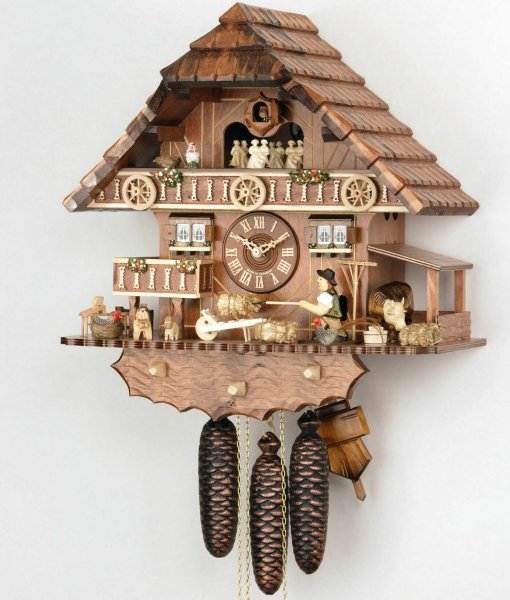 Viel gibt es zu tun auf dem Alphof im Schwarzwald. Diese liebevoll gefertigte Kuckucksuhr aus dem Schwarzwald besticht durch ihre detailgetreuen handgeschnitzten und handbemalten Figuren.